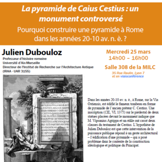Séminaire IRAA « La pyramide de Caius Cestius : un monument controversé. Pourquoi construire une pyramide à Rome dans les années 20-10 av. n. è. ? » par Julien Dubouloz – Mercredi 25 mars 2026 -14h