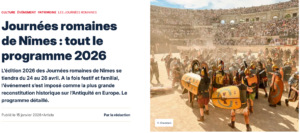 Lien vers le site Internet de Nîmes : https://www.vivrenimes.fr/formats/articles/journees-romaines-de-nimes-tout-le-programme-2026